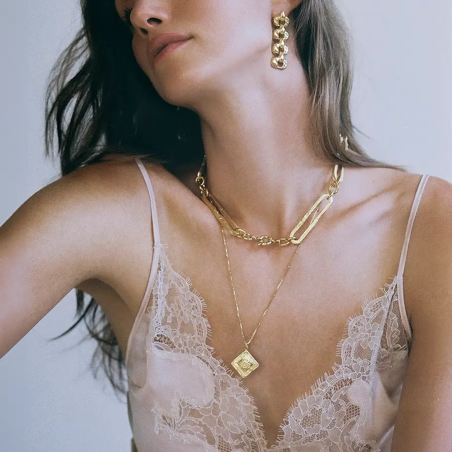 Suspended from a delicate rosary chain, the rhombus pendant captures the refined opulence of a rococo palace, from manicured garden to gilded salon, embodying feminine grace, lasting legacy, and quiet strength.
